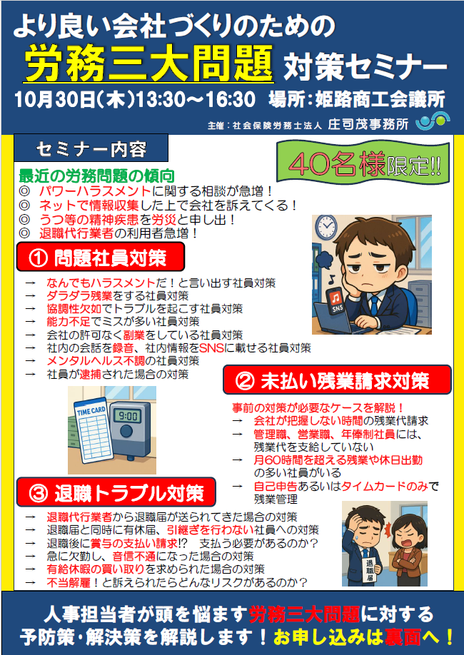 パワーハラスメントや、退職代行を使っての退職トラブル等、近年増加している問題への対策や対応を解説します!!労務トラブルの対策を事前対策をお考えの経営者・役員・管理者の皆様は是非ご参加ください!