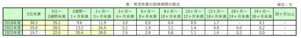 男性の育児休業はこれまで数日間など、非常に短いものが多いとされてきましたが、2023年度の育児休業の取得期間(2022年4月1日から2023年3月31日までの1年間に育児休業を終了し、復職した男性の育児休業期間)は長期化の傾向が見られ、「1ヶ月~3ヶ月未満」が最多となりました。育児休業の取得期間の割合を2018年度、2021年度と比較してみると、下表のようになります(※表はクリックで拡大されます)。2週間以上取得する人の割合が増えていることがわかります。