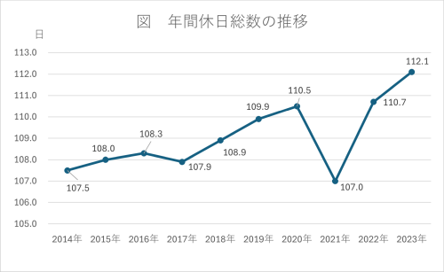2024年の年間休日総数を1企業平均で見てみると112.1日となりました。2023年は110.7日となっていたことから、1.4日増加しています。この年間休日総数について、2014年以降の10年間の推移を見てみると、新型コロナウイルスの感染拡大で社会が混乱した2021年を除き、全体的に増加傾向にあります。※図はクリックで拡大されます。