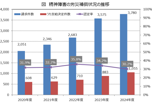 精神障害の労災補償状況は下図のとおりとなっています。2024年度の請求件数は3,780件で、前年度の3,575件から205件の増加となり、過去最多となりました。また、支給決定件数については1,055件となり、前年の883件から172件の大幅増加となりました。こちらも過去最多となり、今回1,000件を初めて超えました。